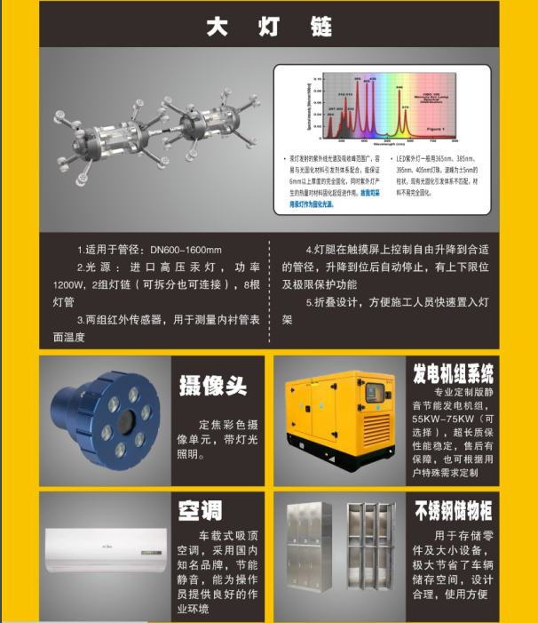 (4)依據(jù)不同管徑,紫外線UV燈架以0.5米/分鐘--1米/分鐘 的巡航速度固化,施工周期短(單段50米軟管紫外